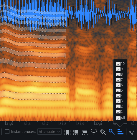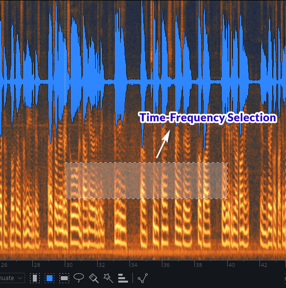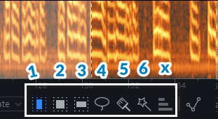 - Frequency Selection : Memilih porsi berdasarkan frekuensi, berbeda dengan time selection yang menyeleksi bagian audio dengan cara drag kiri ke kanan, fs menyeleksi secara drag atas-bawah, seleksi ini bersifat timeless, yang berarti akan menyeleksi seluruh frekuensi audio.