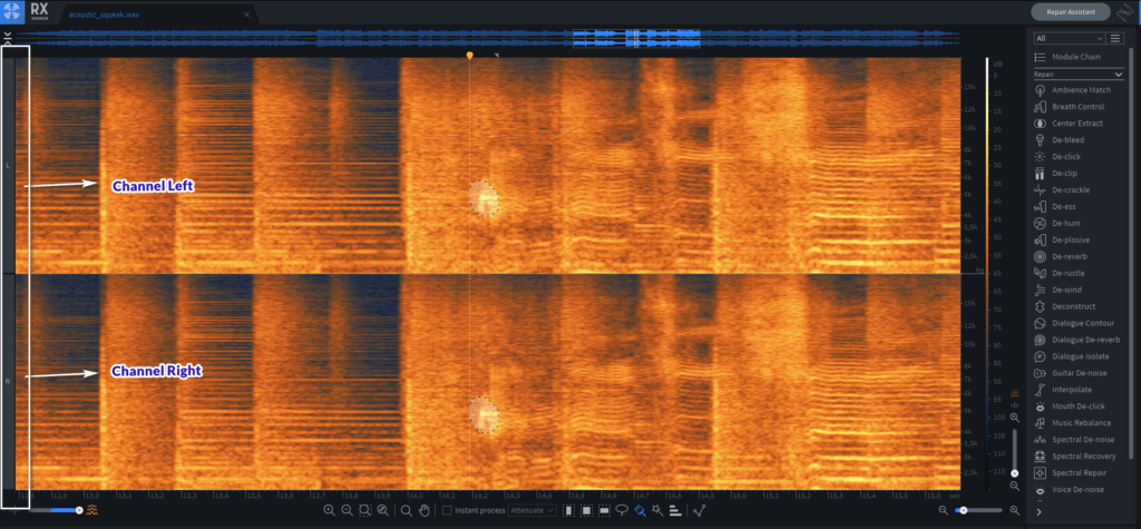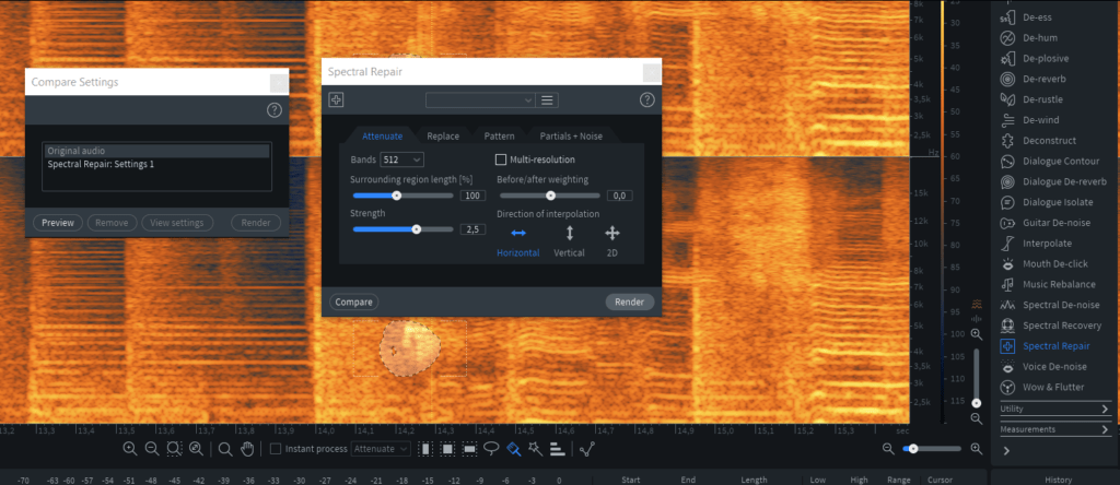 Di sini saya coba eliminasi suara “lecet” di detik ke 14. Saya pilih spectral repair module. Set strength 2.5 lalu pilih compare untuk menyimpan template setting spectral repair.
