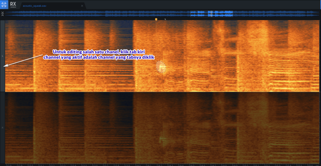 Sekarang kita akan ngedit file dengan format audio stereo (bukan mono), kalian bisa lihat ada dua channel pada file ini. Pada ujung kiri workspace, ada 2 tab L (left) dan R (right)