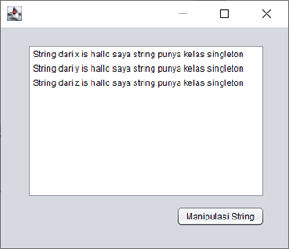 Di sini dapat dilihat nilai String setiap instance singleton sama, baik sebelum dimanipulasi dan sesudah dimanipulasi.