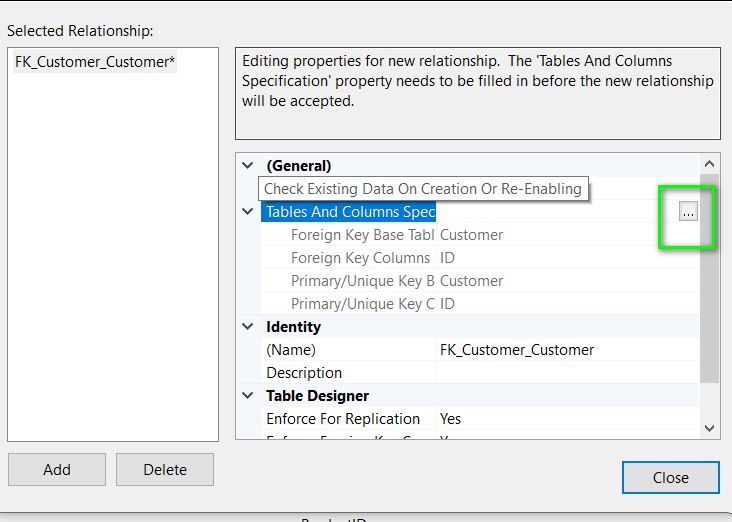 Akan muncul popup, klik Add, akan muncul FK_Customer_dsb pada kiri sidebar, klik teks tersebut, akan muncul list tabs di kanan. Pada tab General, klik icon > pada tables and Column Spec