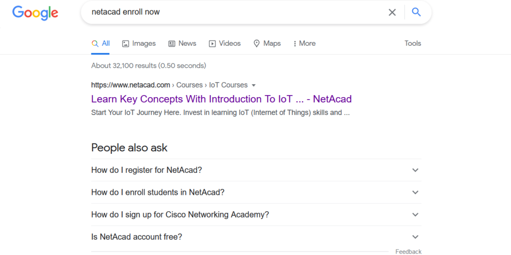Kenapa saya pakai google search? Karena pengalaman saya mencari kursus di website netacadnya langsung, pertama, dulu alamat url untuk enroll kursus itu berbeda, setahuku dulu ada slug(kata) enrollment di urlnya. kedua sulit mencari available enroll melalui website netacadnya karena kebanyakan kalau gak sudah berakhir atau yang muncul adalah yang berbayar. Apalagi gak selamanya kursus gratis akan gratis, jadi random sekali. UX nya memang gak sebagus itu buat nyari free enroll sehingga terpaksa deh cari pakai google 🙂